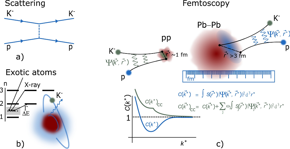 Schematic illustration of available experimental techniques for measuring the interaction among hadrons: a) scattering experiments, b) measurements of energy shifts from the X-ray de-excitation spectrum of exotic atoms, c) femtoscopy in small collision systems (pp) with coupled channel effects shown in green, and in large collision systems (Pb–Pb) with vanishing coupled channel contributions shown in blue.